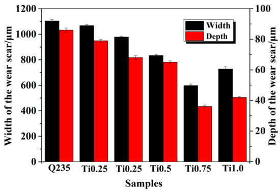To analyze wear resistance, dry sliding wear tests were conducted on both the surfaces of Q235 steel and CoCrFeNiMoTix cladding samples using Si3N4 coupled ball with the diameter of 4 mm. In order to conduct a quantitative analysis of the wear resistance, both depths and widths of the wear scars on samples were measured more than three times, and their average values were obtained, as shown in Figure 5. Both width and depth of wear scar on Q235 steel are the largest, and its material loss is the most severe. In comparison, that of the CoCrFeNiMoTix coatings are relatively small, and their wear resistance is significantly better than that of the Q235 steel. And as Ti content increases, both widths and depths of wear scars consistently exhibit a pattern of initial decrease followed by subsequent increase; especially when x = 0.75, both the width and depth of the wear scars on CoCrFeNiMoTi0.75 coating are the smallest, showing the best wear resistance. These are mainly attributed to the fact that the relatively soft FCC phase can effectively suppress the brittle fracture of the material, while the hard NiTi and BCC phases can serve as a good support for hard points in the process of friction. The combined effect of them makes the coatings exhibit excellent wear resistance. This further indicates that CoCrFeNiMoTix high entropy alloy coatings on Q235 steel surface can significantly improve the wear resistance of Q235 steel.