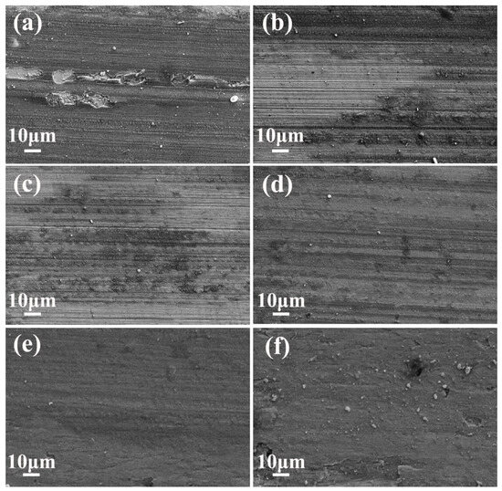 Figure 6 displays SEM results of worn surfaces of CoCrFeNiMoTix coatings and Q235 steel after dry sliding. Figure 6a is the worn surface of Q235 steel. The worn surface of Q235 steel exhibits distinct, parallel, and deep plow-like features, and there is a large amount of exfoliation, indicating that the Q235 steel has been severely worn and damaged. This phenomenon can be primarily attributed to the fact that the hardness of Q235 steel is only about 150 HV, while the hardness of Si3N4 coupled ball is about 1500 HV. The huge difference in hardness between them causes the hard Si3N4 coupled ball to continuously cut the Q235 steel during reciprocating sliding, resulting in lots of peeling pits and plowing grooves on the worn surface of latter, exhibiting wear mechanisms of exfoliation and abrasive wear. Worn surfaces of CoCrFeNiMoTix high entropy alloy coatings become significantly cleaner and smoother, with no obvious peeling pits appearing. In Figure 6b–d, CoCrFeNiMoTix (x = 0, 0.25, 0.5) high entropy alloy coatings only exhibit some parallel plow-like features on the worn surface, indicating the main wear mechanism of abrasive wear. However, it is worth noting that when 0 ≤ x ≤ 0.5, as the Ti content increases, the depths of these plows on the coating’s worn surface gradually weaken, this is consistent with previous results on wear resistance (widths and depths of wear scars). As the Ti content further increases to 0.75, as depicted in Figure 6e, the worn surface of the CoCrFeNiMoTi0.75 coating is clean and smooth, with only a small amount of shallow plow-like features, exhibiting the slight abrasive wear mechanism. This further indicates that the CoCrFeNiMoTi0.75 coating has the best wear resistance. When x = 1.0, there is a certain degree of delamination on the worn surface of the CoCrFeNiMoTi coating, and the wear resistance is significantly weakened compared to CoCrFeNiMoTi0.75 high entropy alloy coating. These results are very consistent with the hardness change pattern mentioned earlier. Based on the Archard law [24], it is commonly observed that the wear resistance of metal materials tends to be directly proportional to their hardness. Therefore, the CoCrFeNiMoTi0.75 high entropy alloy coating, which possesses the highest hardness, demonstrates superior wear resistance compared to other coatings.