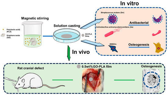 Brief schematic diagram of the preparation of the GO-PLA films, osteogenesis, and antibiosis.