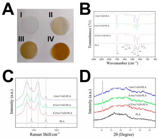 Characterization of the PLA and 0.25/0.5/1.0 wt% GO-PLA films. (A) Images of PLA (I), 0.25 wt% GO-PLA (II), 0.5 wt% GO-PLA (III), and 1.0 wt% GO-PLA (IV), respectively. (B) FTIR, (C) Raman, and (D) XRD analyses of the PLA and GO-PLA films.