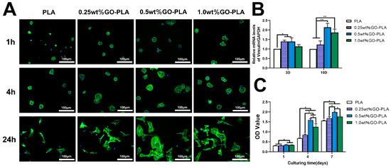 Cell adhesion and proliferation assay. (A) Fluorescence images of rBMSCs cultured on the PLA and GO-PLA films surface after 1, 4 and 24 h of incubation. (B) Vinculin gene expression of rBMSCs cultured for 3 and 10 days. (C) Cell proliferation of rBMSCs cultured for 1, 4 and 7 days. (*) p < 0.05, (**) p < 0.01. (scale bar = 100 μm).