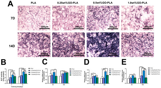 ALP staining and quantification of ALP activity were employed to assess the early osteogenic potential of rBMSCs on various films. ALP serves as not only a participant in the mineralization process but also an important marker for early osteogenesis [58]. Following 7 and 14 days of culture, the GO-incorporated scaffolds exhibited more intense staining compared to the control group, indicating that GO significantly enhanced ALP expression, particularly in 0.5 wt% GO-PLA films (Figure 4A). This finding was further supported by quantitative analysis of ALP activity, which demonstrated increased expression across all concentrations of GO-PLA films (Figure 4B).