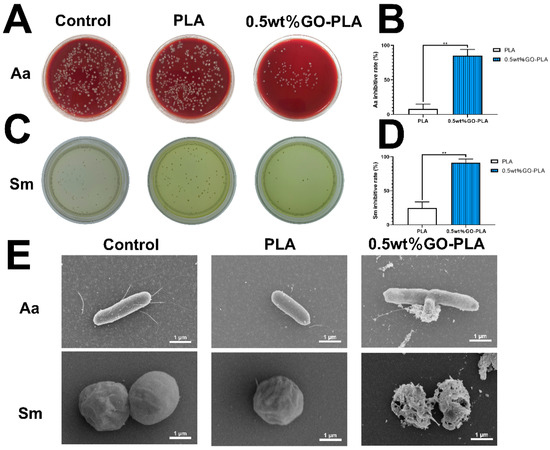 Antibacterial activity of PLA and 0.5 wt% GO-PLA films. Photographs of recultivated (A) Aa and (C) Sm colonies cultured on the PLA and 0.5 wt% GO-PLA films the for 24 h. (B,D) Analysis of reduction percentages of bacteria colonies. (E) SEM images of Aa and Sm cells. (**) p < 0.01. (scale bar = 1 μm).
