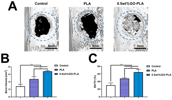 In summary, we have successfully prepared GO-modified PLA films. In vitro results showed that GO-PLA films could enhance cell adhesion compared with the pure PLA film. In addition, when the concentration of GO increased to 0.5 wt%, it could significantly enhance the proliferation of rBMSCs, but when the concentration was further increased to 1.0 wt%, the proliferation of rBMSCs decreased. At the same time, the addition of GO not only promoted the expression of ALP, but also increased the expression levels of other osteogenesis-related genes. GO-modified PLA films had good antibacterial ability, which could effectively inhibit the proliferation of gram-positive bacteria Sm and gram-negative bacteria Aa. Moreover, the results of in vivo animal model further confirmed that GO-PLA films could effectively promote the regeneration of bone tissue. In conclusion, our study has proved that GO-PLA film is a potential bone tissue biomaterial.