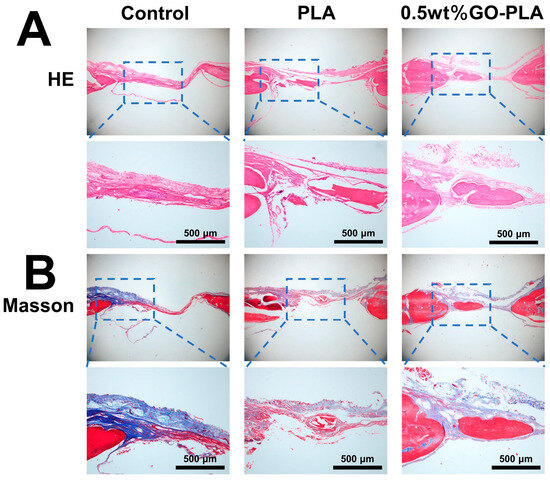 The role of film-guided bone regeneration was investigated in a rat skull defect model, with the untreated group serving as the control. After 8 weeks of implanting the films into the rat skull defect, micro-CT scanning was performed to observe the regenerated bone. As depicted in Figure 6A, three-dimensional reconstruction revealed minimal new bone formation in the blank control group compared to its initial size (4 mm diameter indicated by blue circle), while both experimental groups exhibited greater new bone growth than the control group. Notably, the 0.5 wt% GO-PLA film demonstrated nearly complete closure of the bone defect area, indicating significantly enhanced new bone regeneration compared to the pure PLA film alone. Figure 6B,C illustrate newly formed bone volume (BV) and ratio of BV to total volume (BV/TV), respectively. The results demonstrate superior outcomes for both pure PLA and 0.5 wt% GO-PLA films over the blank control group. Moreover, at a concentration of 0.5 wt%, GO induced more new bone generation than pure PLA alone. Histological analysis through HE and Masson staining on decalcified specimens further supported these findings (Figure 7). In all samples, new bone formation was considerably lower in the blank control group compared to both experimental groups, with most areas being covered by soft tissue only. Partial coverage with newly formed bone was observed in the pure PLA group; however, it was most pronounced in the 0.5 wt% GO-PLA group which exhibited extensive new bone growth relative to other groups examined herein.