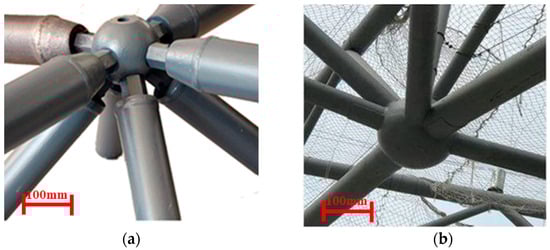 In space grid structures, joints serve to connect members and transfer loads. A failure in a joint could lead to a redistribution of stresses, possibly resulting in the collapse of the entire structure. Hence, studying the mechanical properties of joints is crucial. Bolted spherical joints (BSJs) and welded hollow spherical joints (WHSJs) are widely employed joint types in space grid structures. BSJs are notable for their high degree of prefabrication and ease of installation, while WHSJs are characterized by simplistic stress states and a high bearing capacity. The details of the BSJ and the WHSJ are shown in Figure 1a,b. Both are extensively used in various public and industrial building sectors like stadiums, airport terminals, train stations, and industrial factories. In recent years, numerous researchers have extensively researched both types of joints.