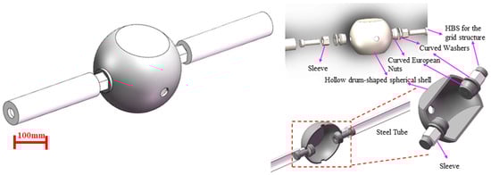 The BDSSJ primarily consisted of high-strength bolts for the grid structure, sleeves, curved European nuts, curved washers, hollow drum-shaped spherical shells, and related members for grids; a detailed assembly of the joint is depicted in Figure 2. The load path aligned with that of the traditional BSJs. When members in the spatial grid were under tension, the load path was as follows: steel tube → cone/seal plate → bolt → hollow drum-shaped spherical shell → tension. Conversely, under compression, the load path was as follows: steel tube → cone/seal plate → sleeve → hollow drum-shaped spherical shell → compression.