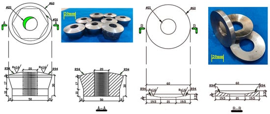 This paper utilized curved European nuts, one end of which was cut to have a convex surface with a diameter identical to the inner diameter of the spherical shell, ensuring a tight fit; the other end was optimized to reduce the nut’s volume and weight to save steel. A single-sided spherical washer was placed between the sleeve and the shell’s connection surface, with one side milled to match the shell surface’s concave curvature. Therefore, the diameter of the spherical washer’s curvature equaled the spherical shell’s outer diameter. The detailed dimensions and actual images of the curved European nuts and curved washers are shown in Figure 4.