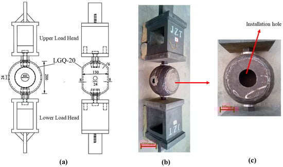 The specimens for this experiment were assembled from high-strength bolts, curved washers, curved European nuts, and drum-shaped spherical shells. High-strength bolts were fastened through the installation holes on the drum surface. Three groups of specimens were selected for the static load axial compression test to ensure the experiment’s reliability, labeled with the serial numbers LGQ-20-1, LGQ-20-2, and LGQ-20-3, respectively.