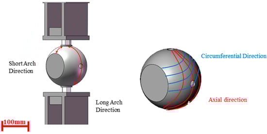 Strain gauges were placed on the surface of the joint specimen to monitor and record strain data pertaining to the joint’s stress distribution under axial compression. The specifications of the strain gauges included a resistance value of 120 ± 0.1 Ω, and a sensitivity coefficient of 2.0 ± 1%. It was stipulated that the tangent direction of the arc line formed by the intersection of the plane perpendicular to the joint’s stress direction and the drum body was called the circumferential direction, while the tangent direction of the arc line formed by the intersection of the plane parallel to the joint’s stress direction (drum surface) and the drum body was called the axial direction. The arc surface formed between the two drum surfaces was referred to as the short arch, and the arc surface formed between two adjacent bolt holes was referred to as the long arch, as shown in Figure 6.
