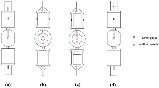 The layout of the strain measurement points: (a) left view; (b) front view; (c) rear view; (d) right view.