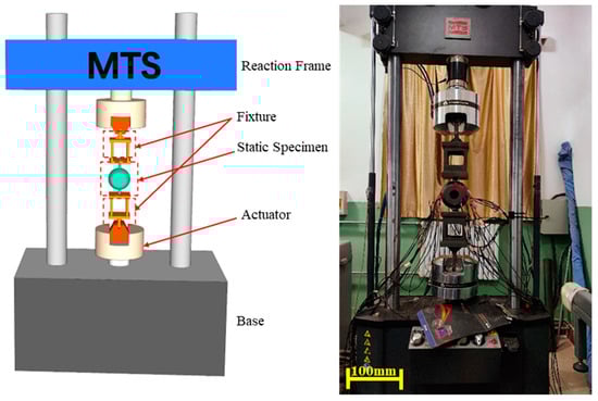 Given that the upper chord members primarily bear axial compression, a uniaxial compressive force was applied along the centerline during the experiment. The loading equipment used was an MTS fully digitized electro-hydraulic servo testing machine, with a loading range of ±500 kN, as shown in Figure 8. Before each experiment, specimens were pre-loaded to check the functionality of the measuring instruments, ensuring the load applied during pre-loading did not exceed 10% of the bearing capacity. Both load and displacement loading methods were employed during formal loading to achieve more accurate measurement results and ensure sufficient structural deformation under the load. Before the specimen yielded, the load was applied in increments of 10 kN at a rate of 5 kN/min, with each level held for 3 min. As the yield status approached, displacement-controlled loading was employed at a 0.1 mm/min rate, with each level held for 2 min. Load and axial displacement data were automatically collected by the testing machine.