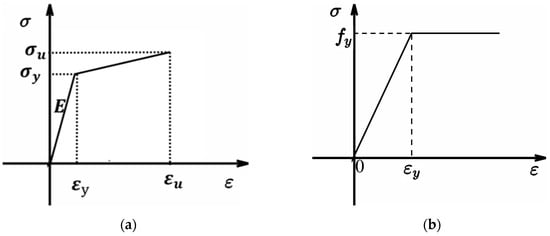 A three-dimensional FEM was established using the ABAQUS, a software for finite element analysis, with the model size identical to the actual specimens’ size. The model was entirely constructed using C3D8R elements, ignoring welding defects and heterogeneities. The load transmission path under the axial compression of the joint is as follows: steel tube → cone/seal plate → sleeve → hollow drum-shaped spherical shell. Therefore, when simulating the compression of the node, only the curved washer, sleeve, and drum-shaped node need to be modeled. The drum-shaped hollow spherical shell was of specification Q345B, with the same material used for the sleeves and bolts. The curved washer and curved nut were modeled using quenched 45# steel. A reinforced elastoplastic bilinear model was used for Q345B, while an ideal elastoplastic bilinear model was used for 45# steel. The elastic modulus (E) was taken as 210 GPa, with a Poisson’s ratio of 0.3. The yield strength for Q345 was 345 MPa, with an ultimate strength of 480 MPa; the yield strength for 45# steel was 420 MPa. The constitutive models for these materials are illustrated in Figure 10 below.