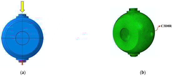 The joint was compressed uniformly downward through the loading fixture in the actual loading process. To simplify the calculation, reference points RP-1 and RP-2 were set on the sleeve surface in a coupled manner in the model. RP-1 was used as the loading point through displacement for load application, while RP-2 was the reference point for boundary constraints, subject to fixed constraints. In this model, the grid size for the wall thickness was divided into three layers, each about 2~3 mm. In this model with fewer component types, structured mesh division could be conducted for the curved washers and curved European nuts, while swept mesh division was performed on the drum-shaped spherical shell to minimize grid distortion. Friction contact was set between the sleeve’s bottom surface and the curved washer’s contact surface, and between the curved washer and the surface of the drum-shaped shell. The normal contact was set to be “hard”, allowing separation after surface-to-surface contact; the tangential friction coefficient was set as 0.2, as shown in Figure 11. The finite element simulation load matches the experimental load.