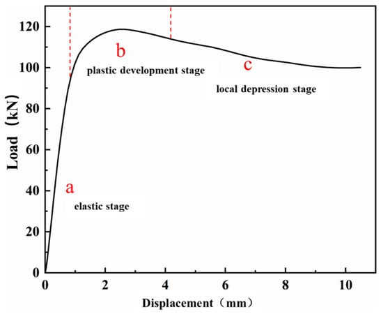 The load–displacement curve of the BDSSJ (a: elastic stage, b: plastic development stage, c: local depression stage).