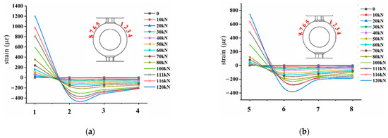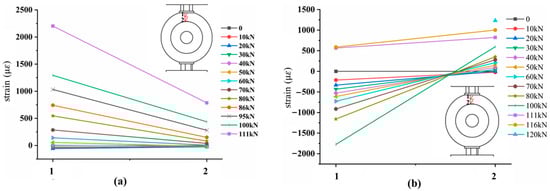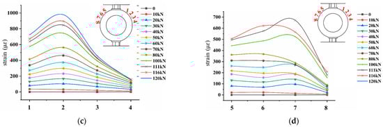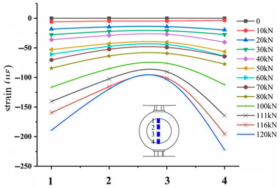 The stress distribution of the drum-shaped spherical shell could be provided by strain gauges attached to the shell. While stress can be deduced from strain during small deformations, the relationship became nonlinear as more significant deformations pushed the joint into the plastic phase. Hence, strain was used as the target parameter for the stress distribution analysis. The results are illustrated in Figure 14.