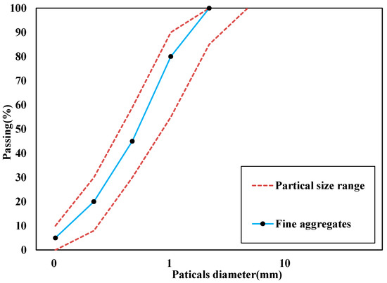 Natural river sand: it is mainly diffuse sedimentary sand, with off-white-gray-yellow color. The fineness modulus is 2.80, water content is 2.3%, mud content is 2.4%, and the apparent density is 2600 kg/m³. Figure 1 shows the set curve of river sand, complying with the Chinese standard GB 50086-2015 (Technical Specification for Geotechnical Anchor and Shotcrete Support Works). Figure 1 shows in detail the grain size distribution of river sand. It is used in this experiment to prepare PR.
