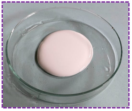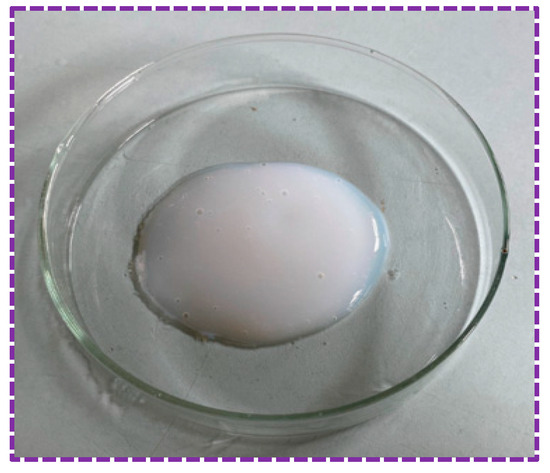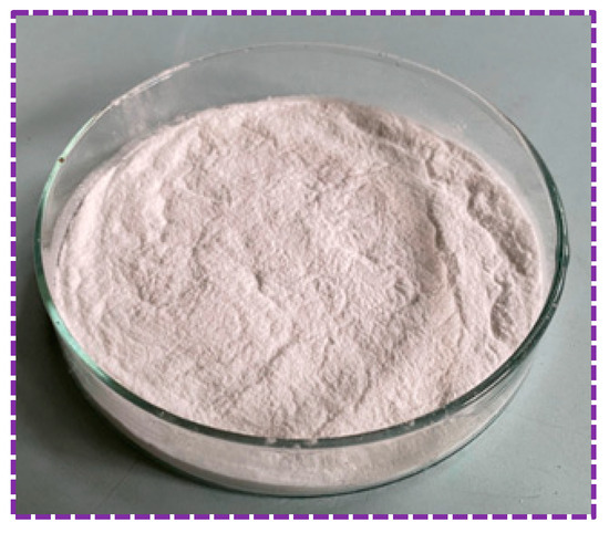 The powder is usually polymerized with vinyl acetate as the monomer, which is then alcoholized or hydrolyzed to make polyvinyl alcohol. It is a white, non-toxic, and odorless powder solid, as shown in Figure 4. The aqueous solution’s pH of polyvinyl alcohol powder is 4.5–6.5. It has a minimum film-forming temperature of 2 °C and is produced by Qingdao Urso Chemical Technology Co. (Qingdao, China).