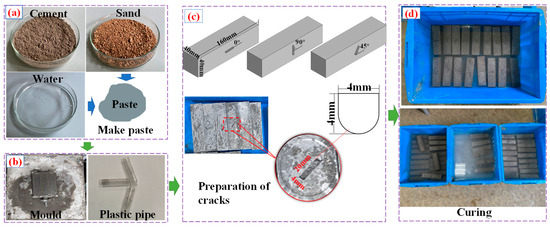 The specific operation steps were: (1) cement, fine sand, and water were mixed well beforehand, then loaded into the triclinic mold and densely vibrated on a vibrating table. (2) The specimens were first cured under natural conditions for 4 h, and three angles of the cracks were prepared on the specimens. The plastic tube was pressed in the center of the specimens with a certain strength until the plastic tube was completely in the specimens, after which the plastic tube was carefully removed. The diameter of the plastic tube was 4 mm and the length was 20 mm, as shown in Figure 6b. The prefabricated crack was 4 mm deep, 4 mm wide, and 20 mm long, and it was tilted at 0°, 45° and 90°, as shown in Figure 6c. (3) After that, the specimens continued to be set in the triclinic mold for 20 h and then demolded. (4) The demolded specimens were cured in water for 7 d and then cured for 28 d in nature. The curing temperature fluctuated between 23 °C and 26 °C. The whole preparation process is shown in Figure 6.