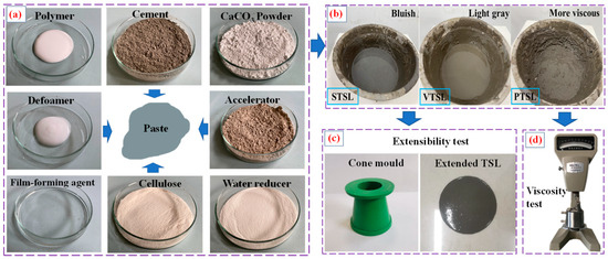 Extensibility test and viscosity test. (a): Raw materials for TSL preparation; (b): preparation of TSL slurry; (c): extensibility text; (d): viscosity test.