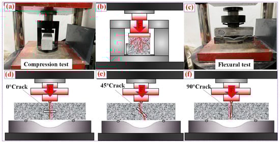 Schematic diagram of the compressive test, flexural test, and the damage of the PR-TSL. (a): Compression test; (b): schematic diagram of the test specimen being damaged by pressure; (c): flexural test; (d): schematic diagram of the 0° test specimen being damaged by bending; (e): schematic diagram of the 45° test specimen being damaged by bending; (f): schematic diagram of the 90° test specimen being damaged by bending.