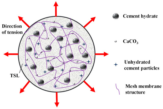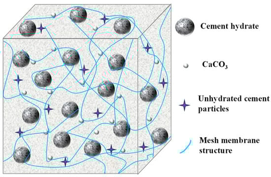 When the number of brush times was 3, the thickness of brush slurry was about 4.2 mm, which completely occupied the crack surface. At this time, the hydration of STSL played a major role, leading to polymer film formation. With the help of gravity and capillary effects, STSL easily penetrated into the capillary pores and surface cracks on the surface of the PR. The water molecules were smaller compared with cement particles and polymer particles, so it was easier to move within the cracks. Although capillary pores and crack walls of the PR absorbed part of the water, the amount of absorption was relatively small compared to the whole brushing volume. This had less effect on the hydration of STSL. Within the capillary pores of PR, as the hydration reaction of STSL proceeded, water levels decreased continuously, and the polymer particles agglomerated to form a continuous layer on the surface of unhydrated cement particles, the C-S-H gel, and between aggregates and the polymer cement paste. The intermolecular forces caused the polymer particles to agglomerate into a continuous film, which, together with hydration products, formed a penetrating mesh structure, as shown in Figure 16 [31,32,33,34,35]. STSL can penetrate into the capillary pores and surface cracks of the PR during the repair process. When the capillary holes and surface cracks are compressed, STSL provides good support. When they were tensile, STSL connected the two ends. Thus, it was difficult for the capillary pores and cracks to reach the displacement required for damage, so the repair effect was realized.