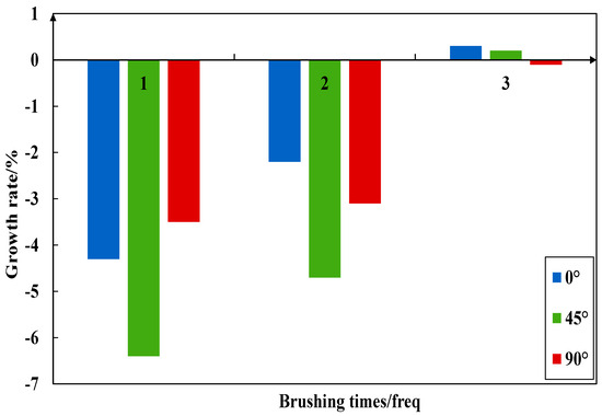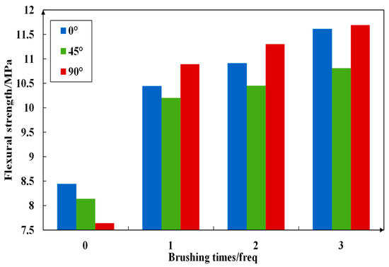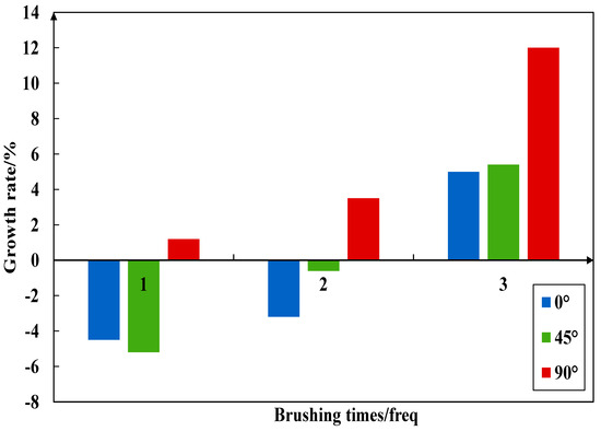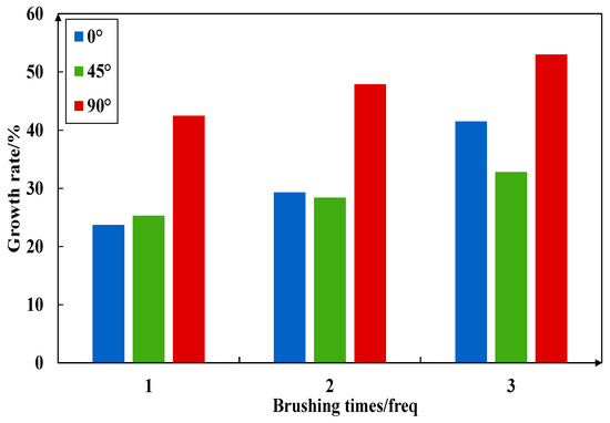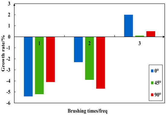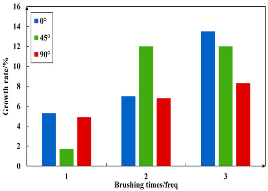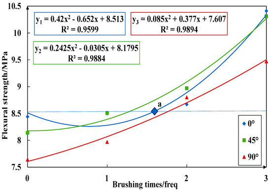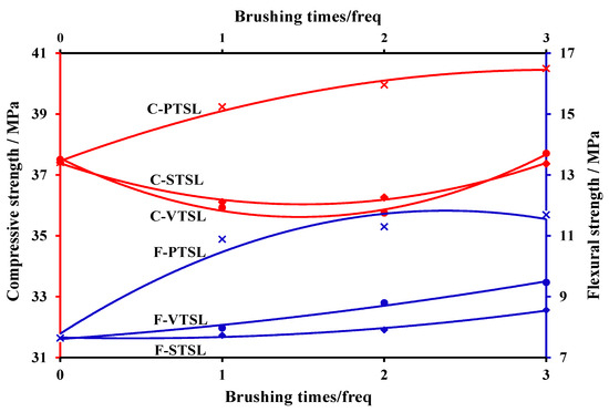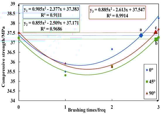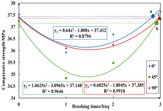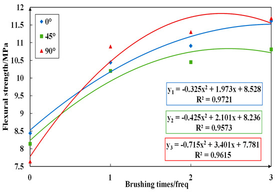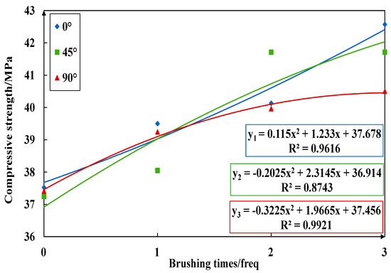 Figure 23, Figure 24, Figure 25 and Figure 26 imply the effect of PTSL on the repair of PR. From the information in Figure 23 and Figure 25, the R2 of all six fitted curves is greater than 0.87, which indicates a good fit. Therefore, the repair effect of STSL is in accordance with the variation of the relation y = ax2 + bx + c. The repair trends shown in Figure 23 and Figure 25 show continuous improvement. According to the characteristics of the quadratic equation, the slope of the six trend lines in the figure is the highest when the number of brushing times is 0–1, which indicates that the strength of PR-TSL is improved the most when brushed once. PTSL can achieve a good repair effect, but the repair effect is not improved significantly with the increase in brushing times.