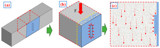 According to our analysis, STSL has good fluidity and low viscosity. When the number of brushing times is 1 and 2, the thickness of brushing slurry is about 1.5–2.8 mm, and TSL does not occupy the whole crack. The main role in this phase is played by the stress concentration around the crack under external pressure. Moreover, STSL penetrates into the tiny surface cracks and capillaries of PR with its own excellent fluidity. The capillary pore is a hydrophilic capillary pore. Although it is beneficial to the infiltration of STSL, its cement wall surface also absorbs part of the water. This phenomenon is not beneficial to twater participation in the hydration of STSL, so STSL did not reach the expected strength within 7 d. As a result, STSL was brushed around the cracks, an operation similar to adding foreign material into the cracks and capillaries, leading to stress concentrations under pressure [36,37,38], as shown in Figure 15. The red arrows in Figures 15, 16 and 21 represent stresses. This resulted in damage forming first from around the crack, which is not beneficial to the repair of PR by STSL.