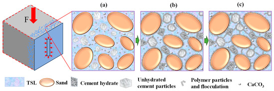 The test results of the control groups C-1 and C-2 showed that the compressive strength and flexural strength of the rock-like materials were 43.81 MPa and 10.11 MPa, respectively, and the ratio of bending to compression was 0.3. It was evident that the ratio of bending to compression of TSL was significantly higher than that of the rock-like materials, indicating that the toughness of TSL was better. In this experiment, the curing temperature was between 23–26 °C, which was greater than the minimum film-forming temperature of the three polymers. According to the Ohama model [31] and the B-O-V model [32], it is known that the continuous hydration of the cement in TSL glues the polymer particles into a film, forming a spatial mesh structure that enhances the toughness of TSL [33,34,35], as shown in Figure 10.