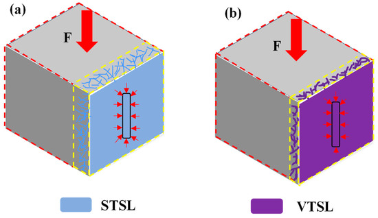 According to our analysis, the repair of PR compressive strength by VTSL tended to decrease and then increase. VTSL itself has relatively good fluidity. When applied with 1 or 2 brushings, resulting in a 1.5–2.8 mm thickness of brush slurry, VTSL does not occupy all of the crack. What plays a major role at this phase is the concentration of stresses around the crack under external pressure. The repair effect exhibited at a brush slurry number of 3 can also be explained by the polymer film formation phenomenon. Compared with STSL, the damage effect of VTSL was weaker and the repair effect was stronger, which may be due to the fact that VTSL was less fluid than STSL. The stress concentration area formed by VTSL was smaller than that of STSL, as shown in Figure 21, where the stress concentration area was within the yellow dashed line. Moreover, the compressive strength of VTSL was 19.43 MPa greater than that of STSL, which was 16.02 MPa. This made VTSL relatively stronger in supporting capillaries and cracks.