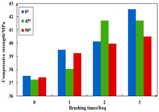Figure 28 demonstrates that the unrepaired PR containing a 45° crack is the most easily damaged in the compressive experiments. The compressive strengths of PR containing 0° cracks and PR containing 90° cracks are close to each other. This is consistent with the previous study [41,42,43]. However, PR containing a 45° crack is not the most easily damaged when the slurry is brushed twice.