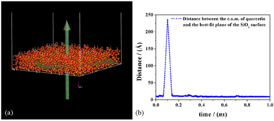 During all four MD runs, the drug molecule shows high mobility near the amorphous surface due to weak intermolecular interactions. Due to its chemical structure compared to the newly studied ketoprofen drug molecule, the single quercetin molecule can form more H– bonds with the silica surface, so an adsorption–desorption process occurs. After the adsorption process, the desorption process can also take place thanks to the kinetic energy of quercetin at the simulation temperature, which can overcome the weak intermolecular interaction. During the MD run at room temperature, after desorption of the quercetin and random motion in the simulation cell, the molecule, as it approaches the silica surface, adsorbs and remains adhered, forming more stable H– bonds. To study the adsorption–desorption process that occurs during an MD run in vacuo at a temperature equal to 300 K, the best-fit plane defined by all silica atoms was characterized (see the green plane in panel (a) of Figure 3), and the distance between the center of mass (c.o.m.) of the quercetin molecule and this silica best-fit plane during the MD run lasting 1 ns has been calculated, as reported in Figure 3, which more precisely starts from the geometry reported in panel (d) in Figure 2.