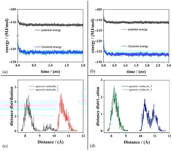 Potential energy and Coulomb contributions calculated in the adsorption process of quercetin molecules at small concentrations (14 drug molecules) during the first MD run lasting 2 ns (panel (a)) and the second MD run lasting 3 ns (panel (b)) on hydrated silica surface. Panel (c) and panel (d) show the distribution of distances between the c.o.m. relating to four different quercetin molecules relative to the silica best-fit plane calculated during MD runs lasting 2 ns (see panel (c)) and 3 ns (see panel (d)), respectively.