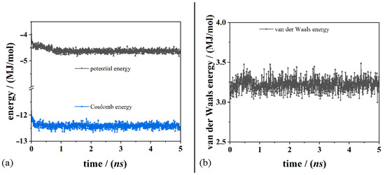 Panel (a) shows the potential energy and Coulomb contributions calculated in the adsorption process in vacuo of quercetin molecules at small concentrations (14 drug molecules); panel (b) shows the van der Waals contribution calculated during the same MD run lasting 5 ns.