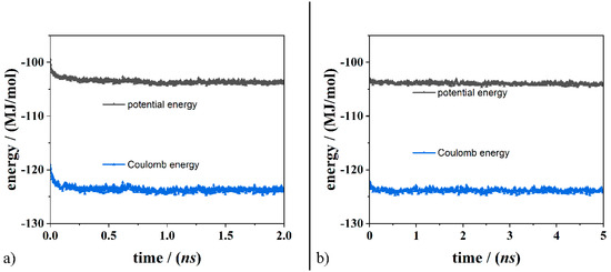 Potential energy and Coulomb contributions calculated in the adsorption process of quercetin molecules at higher concentrations (28 drug molecules) during the first MD run lasting 2 ns (see panel (a)) and the second MD run lasting 5 ns on hydrated silica surface (see panel (b)).