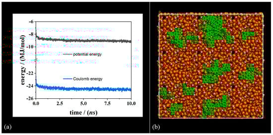 After studying the adsorption process on a hydrated SiO2 surface, using the same procedure used at a small drug concentration [77], the interaction on the dried silica surface loaded by drug molecules is studied in vacuo. Also, in this case, the potential energy shows an initial rapid decrease as for the Coulomb energy, and then it fluctuates around an average value calculated during an MD run at room temperature lasting 10 ns, as reported in panel (a) of Figure 8.