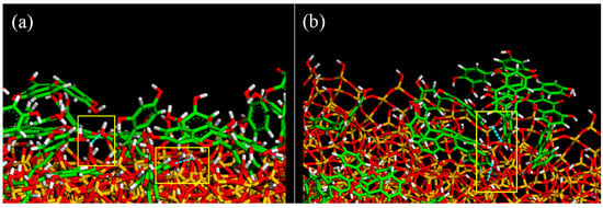 Panel (a) shows the H– bonds between oxygen atoms in quercetin –OH groups and hydrogen atoms in silanol –OH groups. Panel (b) shows the H– bonds between the hydrogen atoms of quercetin –OH groups and oxygen atoms in Si–O–Si of the silica surface. The yellow boxes highlight where these H– bonds are in the figure.