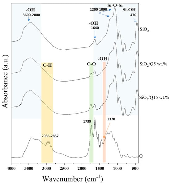 FTIR spectra of quercetin, SiO2/quercetin (5 and 15 wt.%) hybrid materials, and pure SiO2.