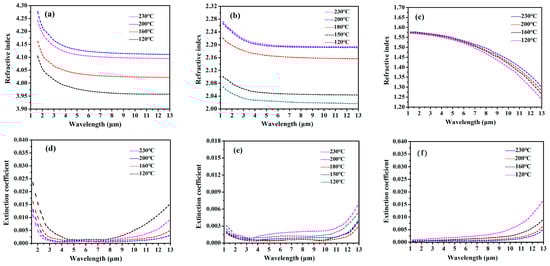 The refractive index of the single-layer Ge coating (a), ZnS coating (b), and YbF3 coating (c), and the extinction coefficient of the single-layer Ge coating (d), ZnS coating (e), and YbF3 coating (f) at different deposition temperatures.