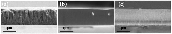 Morphology of the cross-section of sample coatings: the ZnS coating (a), Ge coating (b), and YbF3 coating, (c) deposited at a temperature of 200 °C.