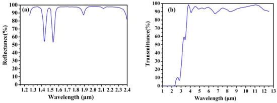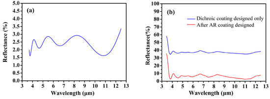 In fact, Ge is a high-refractive-index material with about thirty-six percent residual reflectance on one surface of the substrate. When dichroic coatings are deposited on one side of Ge substrate, the other side of the substrate needs to be coated with broad-band antireflection (AR) coatings to obtain high transmittance in the transmission band of 3.7 to 12.5 μm. Another important aspect is that the ghost caused by the surface reflectance of the substrate can be minimized in the optical system via the fabrication of broad-band AR coatings. The antireflective surface of the dichroic beamsplitter was composed of a multi-layer ZnS/Ge/ZnS/Ge/ZnS/YbF3/ZnS/YbF3/ZnS broad-band AR coating with low reflectance in the spectral region of 3.7 to 12.5 μm. The details of the thickness of each layer are shown in Table 1. A residual reflectance curve of the designed AR coating is shown in Figure 4a, and it exhibits that the simulated reflectance at a 45° angle of incidence is mainly below 2.7%. After one side of the substrate was coated with AR coatings, the average reflectance of the designed dichroic beamsplitter that had been coated with dichroic coatings on the other side was reduced from 36% to 6.0% in the transmission band, as shown in Figure 4b.