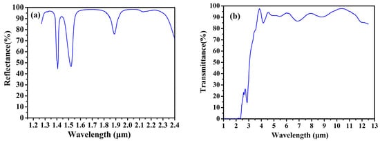 The designed spectral curve is shown in Figure 5a,b, including the theoretical reflectance curve of the reflection channels and the transmittance curve of the transmission channels. The average reflectance of the dichroic beamsplitter in the range from 1.28 to 1.38 μm is 96%, that in the range from 1.58 to 1.83 μm is 98% and that in the range from 1.95 to 2.32 μm is 97.5%, while the average transmittance in the range from 3.7 to 6.2 μm is 94% and that in the range from 7.5 to 12.5 μm is 94.5%. The average reflectance and transmittance of the dichroic beamsplitter can be seen in Table 2.