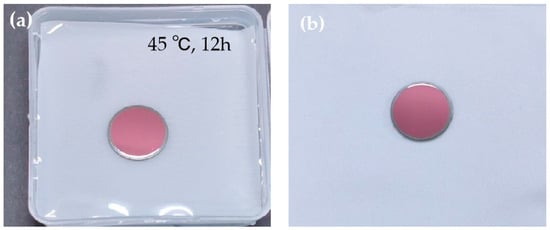 To verify the reliability of the sample, a water immersion experiment was conducted on the sample. The sample was soaked in pure water and placed in an oven at a constant temperature of 45 °C for 12 h. The sample was taken out, and the surface of the film was observed. The surface of the sample was bright and there was no change in color compared to before it was soaked in water, as shown in Figure 7a,b.