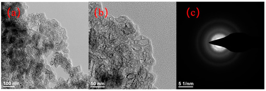 (a) TEM image of the coating at 100 nm. (b) TEM image of the coating at 50 nm. (c) Selected area electron diffraction (SAED) of the coating at 5/1 nm.