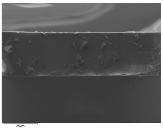 Scanning electron microscope image (25 microns) of a cross-section of coated glass, with the center strip being the coated portion and the lower portion of the out-of-focus region being the glass.
