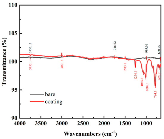 Scanning electron microscopy (SEM, JSM-7500F, Tokyo, Japan) was used to examine the microscopic morphology of the prepared coatings. Fourier transform infrared (FT-IR) spectra were measured with a Fourier transform infrared spectrometer (NEXUS, Thermonics Co., Madison, WI, USA). EDX (JSM-7800F prime, Tokyo, Japan) spectroscopy was used to determine the elemental content of the specimens. Transmission electron microscopy (TEM, FEI Tecnai G2 F30, Hillsboro, OR, USA) was used to determine the coatings’ structures, sizes, and distribution patterns.