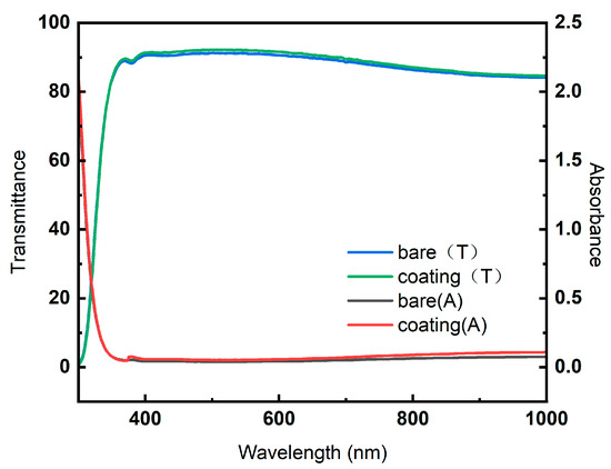 The transparency and the durability responsible for the self-cleaning feature are two contradictory parameters; increasing one parameter strongly implies a decrease in the other [21]. For most coatings, a thicker layer means better durability, but a thicker layer causes a dramatic decrease in coating transparency, which is fatal for PV panel surface coatings, which require high transparency, so it is vital to choose the right thickness and enhance the transparency of the coating. We tested the transmission and absorption spectra of bare and coated glass plates in the wavelength range of 300–1000 nm (Figure 8). We selected three different sites on the same glass and scanned them in the range of 300–1000 nm, and averaged the transmission and absorption data over the entire range of scanned wavelengths. It can be calculated that the average transmittance of the coated glass panel was 0.69% higher than that of the bare glass panel, and the average absorption of light of the coated glass panel was 1.4% lower than that of the bare glass panel. These test data demonstrate that the coating does not affect light capture by the photovoltaic cells through the coated glass but also enhances the light absorption through the anti-reflection effect of the thin coating.
