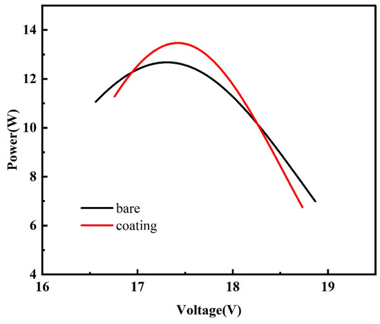 As shown in Figure 13 and Figure 14 the I–V and P–V fitting curves are plotted from the current, voltage, and power data obtained from the three-week test. The maximum power of the bare panel is 13.79 (W), and the maximum power of the coated panel is 13.99 (W); the minimum power of the bare panel is 4.91 (W), and that of the coated panel is 5.56 (W). It can be seen that the coating has a positive effect on the power of the PV panels.