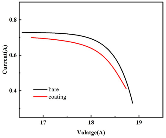 The I–V curve fitted to data from the bare and coated solar panels over 3-week period.