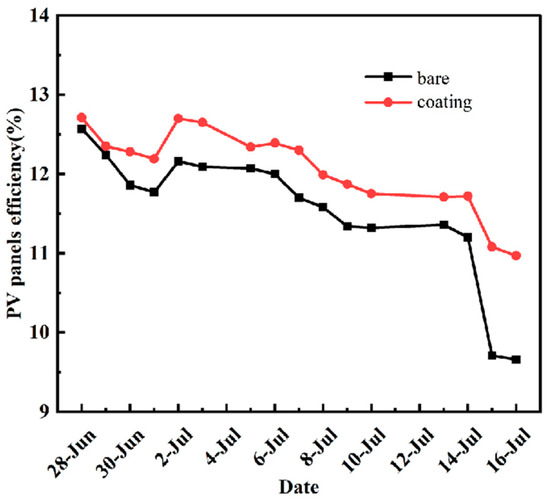 The daily 3-week panel efficiency data of the solar panels are shown in Figure 15. From the data, it can be seen that at the beginning the efficiency of the coated PV panels was about the same as that of the uncoated PV panels, but on the seventh day, the efficiency of the coated PV panels was higher than that of the uncoated PV panels. At the end of three weeks, the efficiency of the coated PV panels was higher than the uncoated PV panels by 1.11%. In three weeks, the efficiency of the uncoated PV panels decreased by 3.8%, while the efficiency of the coated PV panels decreased by only 1.48%. It can be seen in the figure that the rate of decrease in the efficiency of the uncoated PV panels was significantly larger than that of the coated PV panels. The above comparison shows that the coated PV panels have obvious self-cleaning performance.